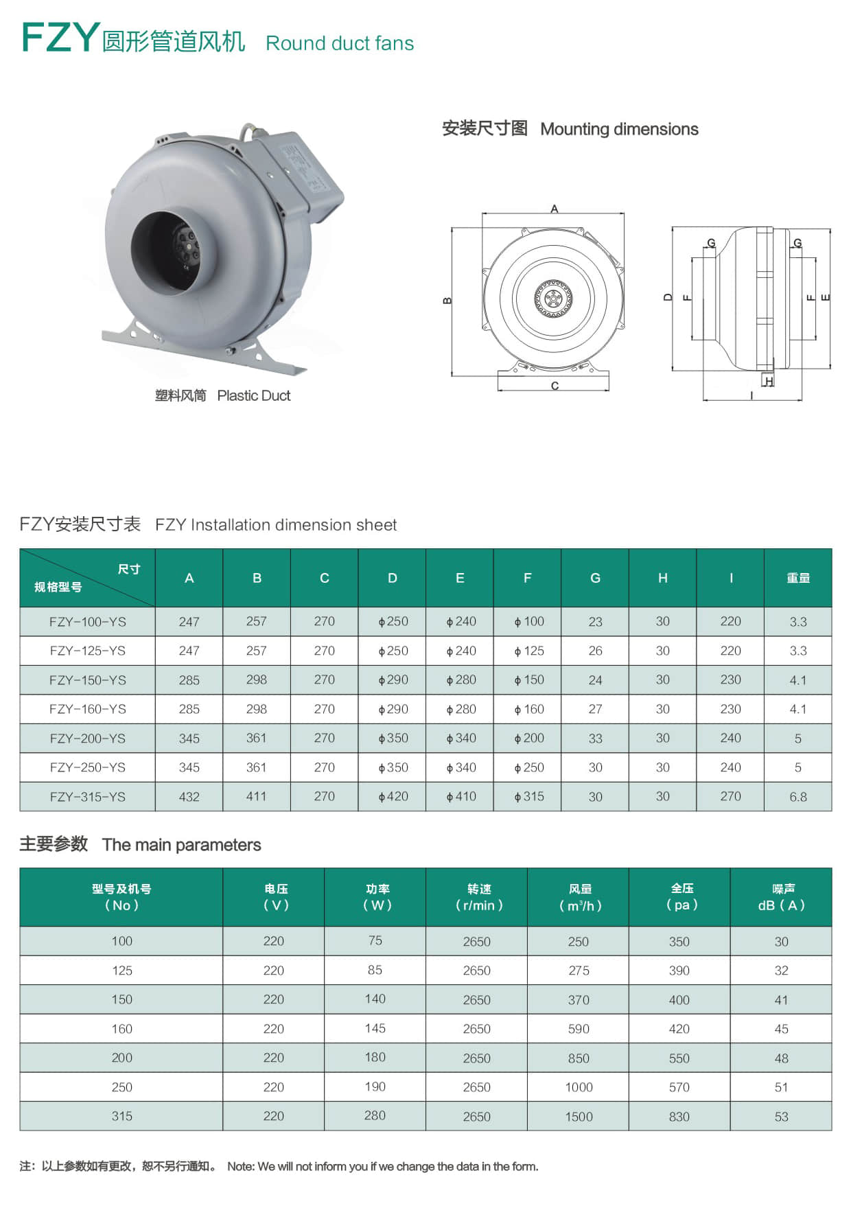 * 电压:单相电容运转风机为220V/50Hz,三相风机为380V/50Hz。我们可以按照客户需求生产不同电压、频率的风机。