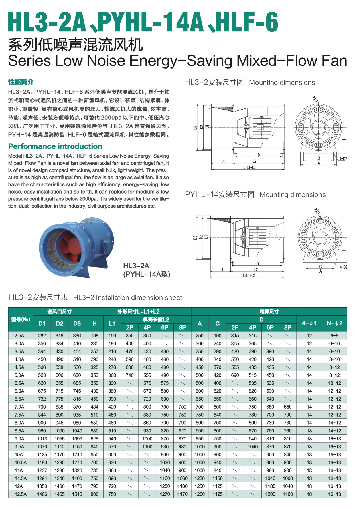 * HL3-2A 是普通通风型, PYHL-14A是高温消防型,HLF-6是箱式混流风机,其性能参数相同。