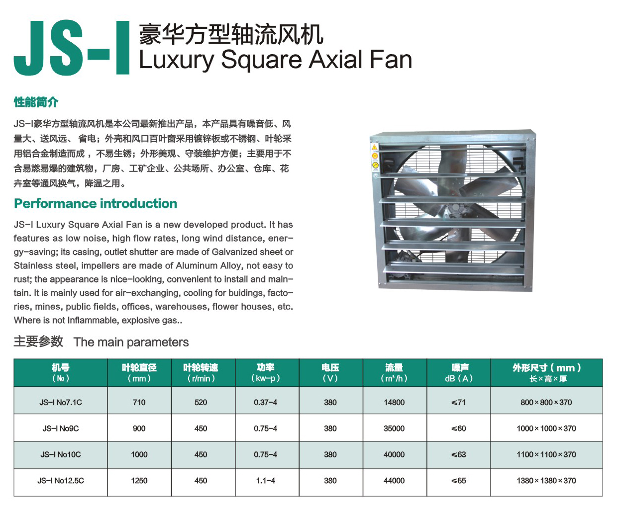 * JS-I豪华方型轴流风机是本公司最新推出产品,本产品具有噪音低、风量大、送风远、省电;外壳和风口百叶窗采用镀锌板或不锈钢、叶轮采 用铝合金制造而成 ,不易生锈;外形美观、守装维护方便;主要用于不含易燃易爆的建筑物,厂房、工矿企业、公共场所、办公室、仓库、花卉室等通风换气,降温之用。