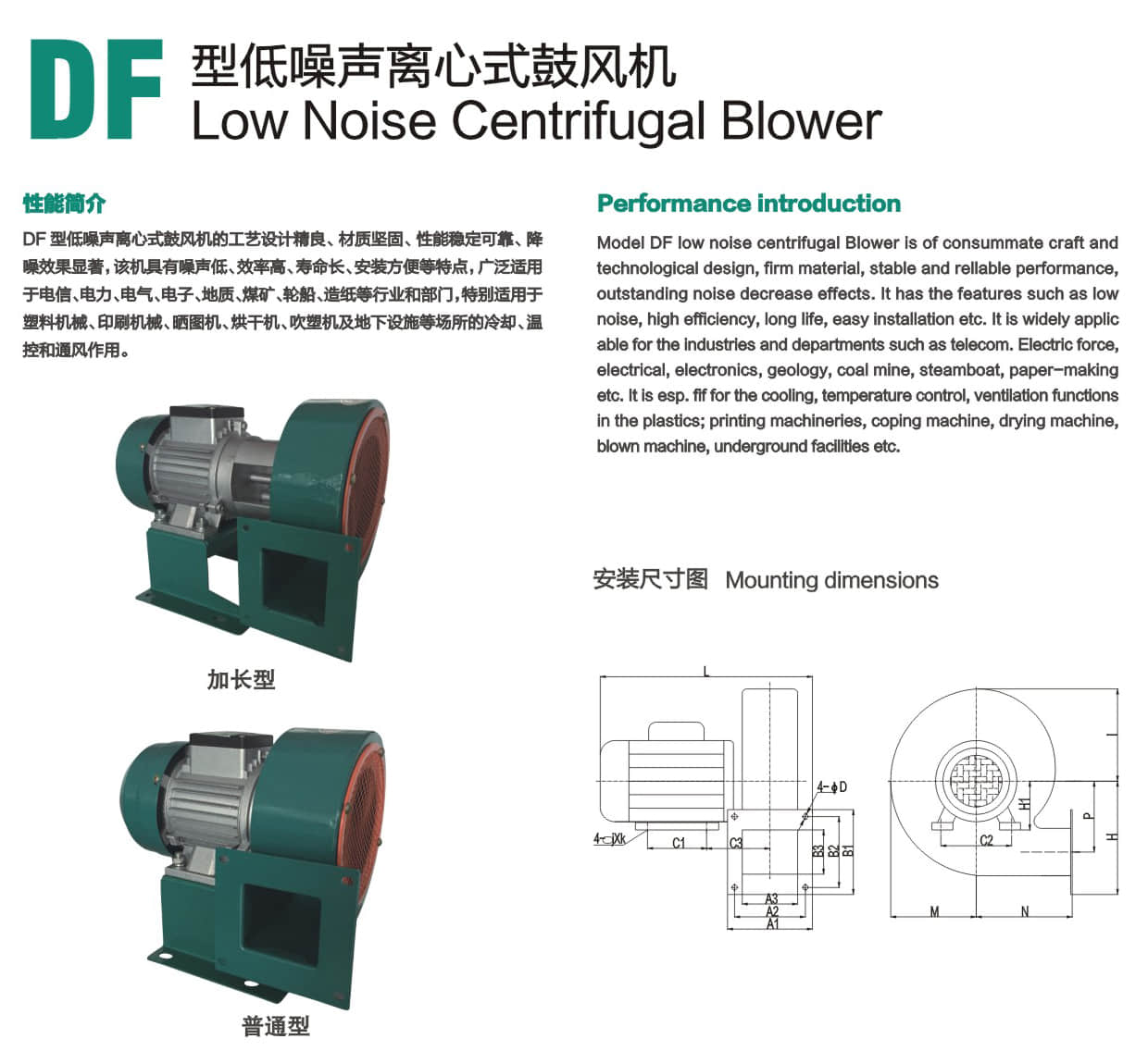 * DF型低噪声离心式鼓风机.的工艺设计精良、材质坚固、性能稳定可靠、降噪效果显著,该机具有噪音低、效率高、寿命长、安装方便等特点,广泛应用于电信、电力、电气、地质、煤矿、轮船、造纸等行业和部门,特别适用于塑料机械、印刷机械、晒图机、烘干机、吹塑机及地下设施等场所的冷却、温控和通风作用。