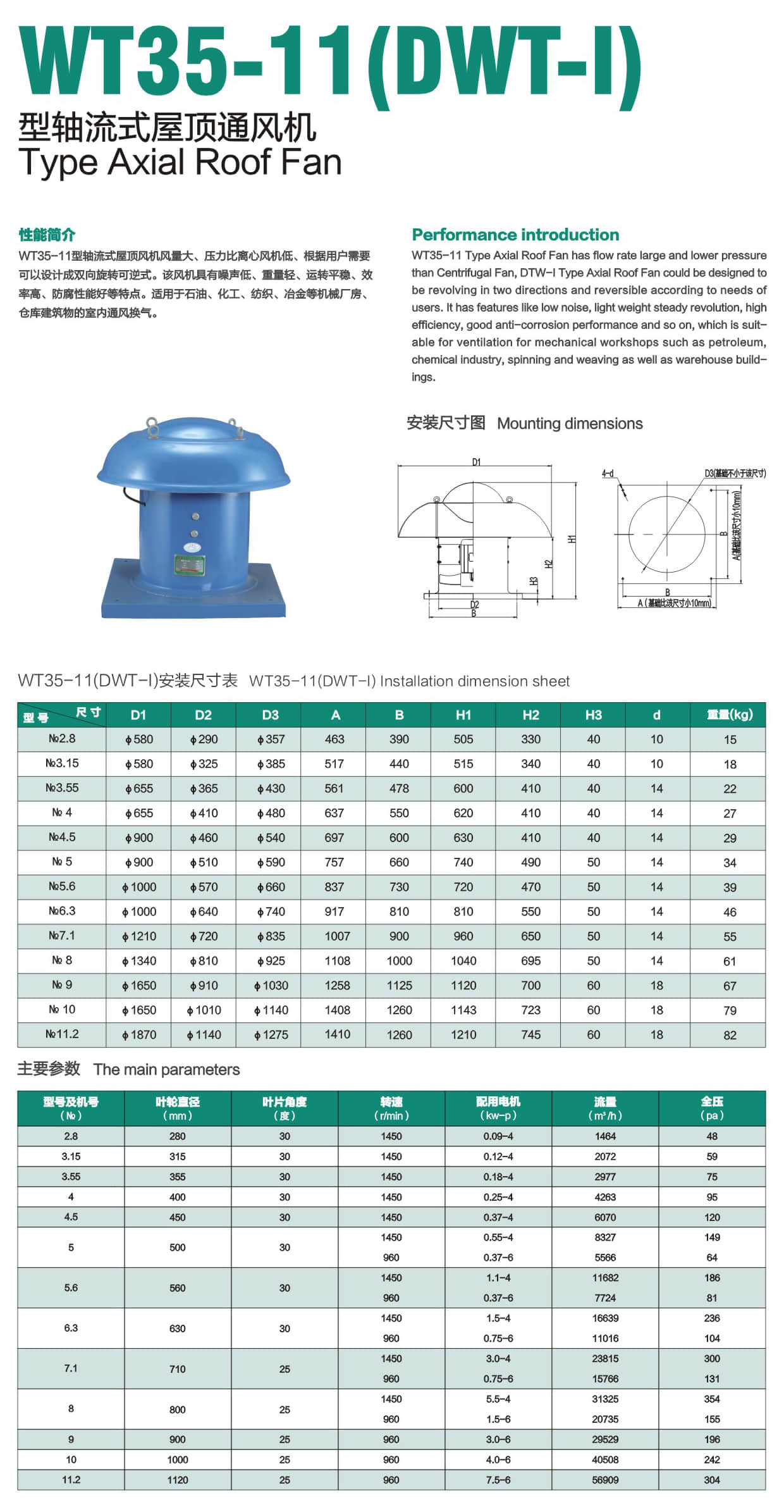 * WT35-11型轴流式屋顶风机风量大、压力比离心风机低、根据用户需要 可以设计成双向旋转可逆式。该风机具有噪声低、重量轻、运转平稳、效率高、防腐性能好等特点。适用于石油、化工、纺织、冶金等机械厂房、 仓库建筑物的室内通风换气。
