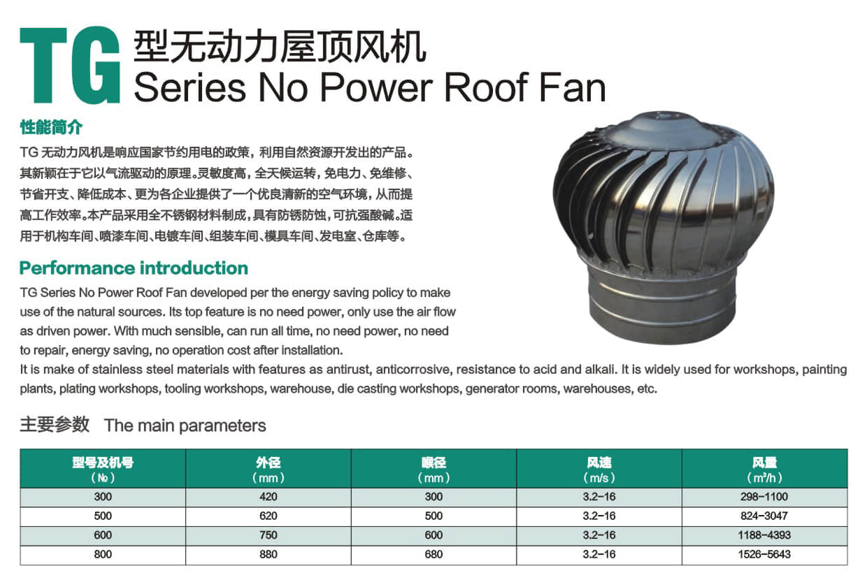 * TG无动力风机是响应国家节约用电的政策,利用自然资源开发出的产品。其新颖在于它以气流驱动的原理。灵敏度高,全天候运转,免电力、免维修、 节省开支、降低成本、更为各企业提供了一个优良清新的空气环境,从而提高工作效率。本产品采用全不锈钢材料制成,具有防锈防蚀,可抗强酸碱。适用于机构车间、喷漆车间、电镀车间、组装车间、模具车间、发电室、仓库等。