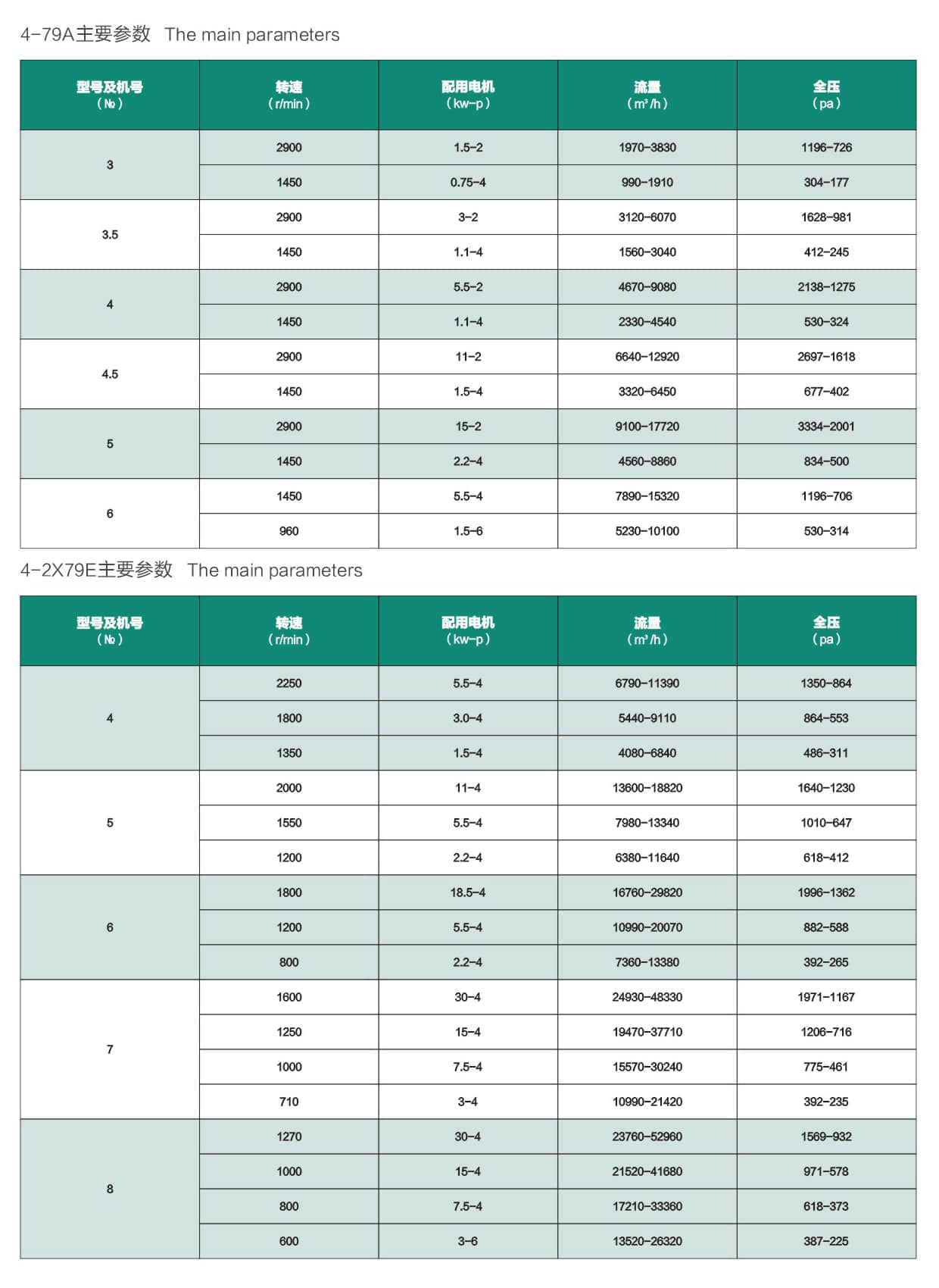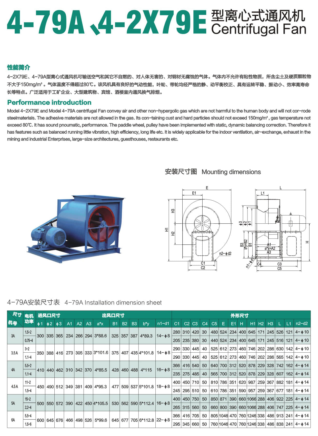 * 4-2X79E、4-79A型离心式通风机可输送空气和其它不自燃的、对人体无害的、对钢材无腐蚀的气体。气体内不允许有粘性物质,所含尘土及硬质颗粒物不大于150mg/m³。气体温度不得超过80℃。该风机具有良好的气动性能,叶轮、带轮均经严格的静、动平衡校正、具有运转平稳、振动小、效率高寿命长等特点。广泛适用于工矿企业、大型建筑物、宾馆、酒楼室内通风换气排烟。