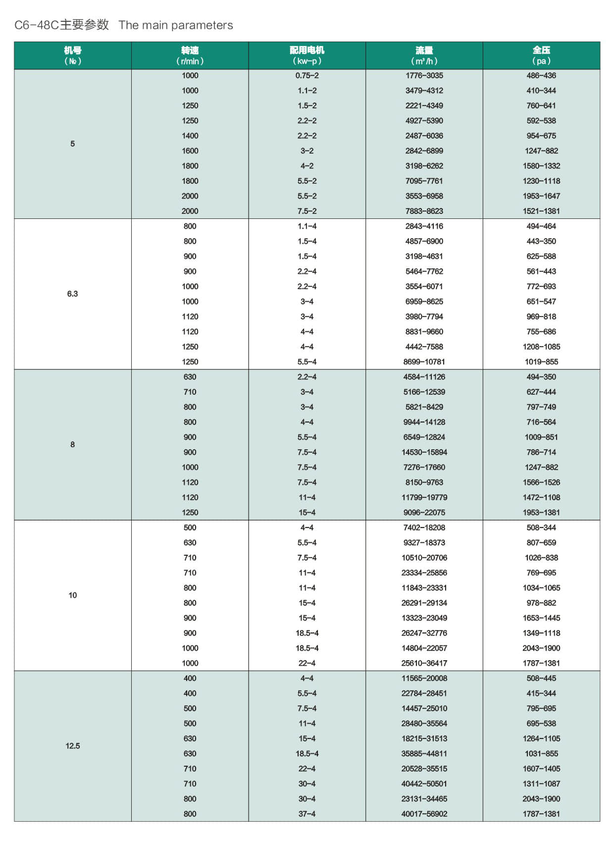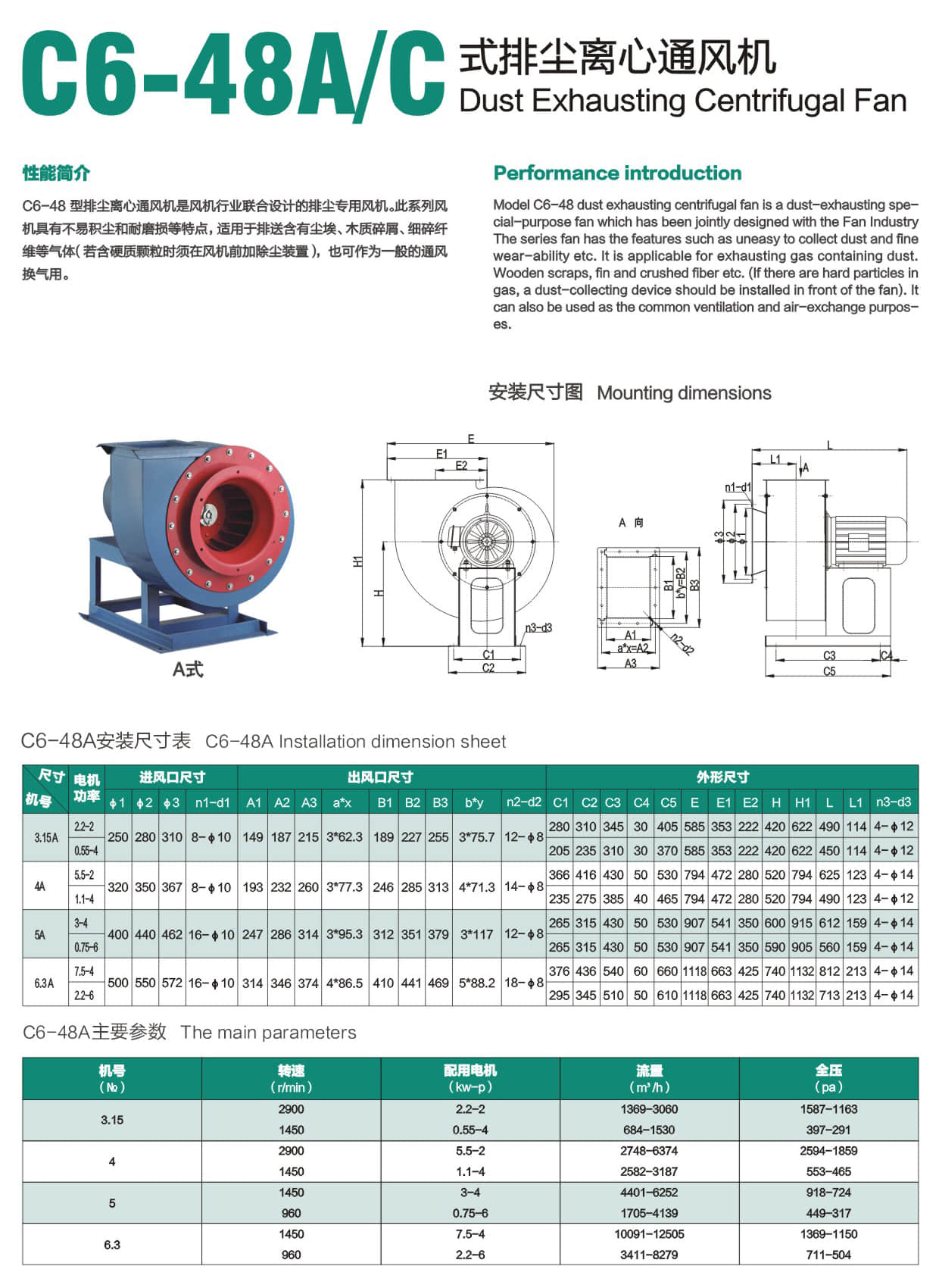 * C6-48型排尘离心通风机是风机行业联合设计的排尘专用风机。此系列风机具有不易积尘和耐磨损等特点,适用于排送含有尘埃、木质碎屑、细碎纤维等气体(若含硬质颗粒时须在风机前加除尘装置),也可作为一般的通风换气用。