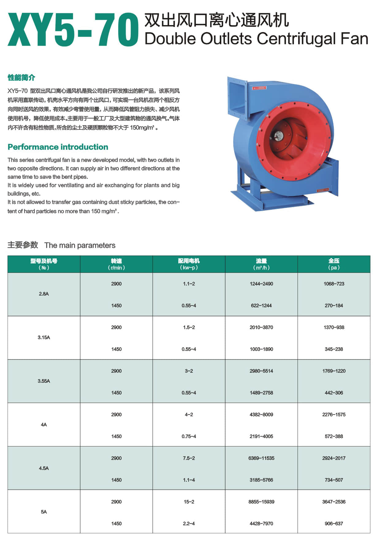 * XY5-70型双出风口离心通风机是我公司自行研发推出的新产品,该系列风机采用直联传动,机壳水平方向有两个出风口,可实现一台风机在两个相反方向同时送风的效果,有效减少弯管使用量,从而降低风管阻力损失、减少风机使用机号,降低使用成本。主要用于一般工厂及大型建筑物的通风换气。气体内不许含有粘性物质,所含的尘土及硬质颗粒物不大于 150mg/m³。