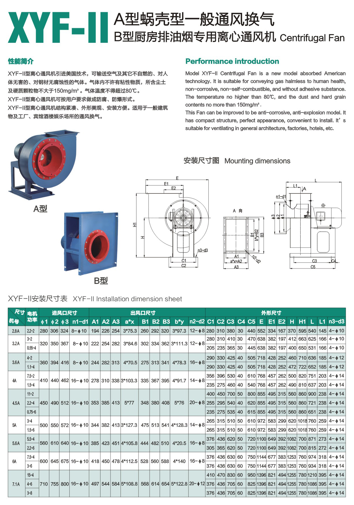 * XYF-II型离心通风机结构紧凑、外形美观、安装方便。适用于一般建筑物及工厂、宾馆酒楼娱乐场所的通风换气。
