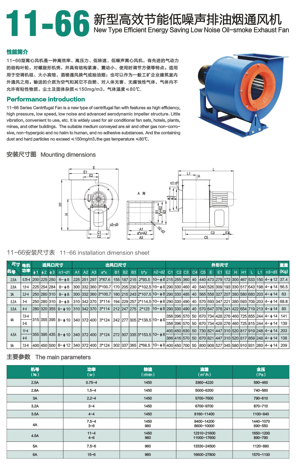 * 11-66 Series Centrifugal Fan is a new type of centrifugal fan with features as high efficiency, high pressure, low speed, low noise and advanced aerodynamic impeller structure.Little vibration, convenient to use, etc. It Is widely used for air conditional fan sets, hotels, plants, mines, and other buildings. The suitable medium conveyed are air and other gas non-corro- sive, non-hypergoic and no halm to human, and no adhesive substances.And the containing dust and hard particles no exceed≤150mg/m3,the gas temperature≤80℃.