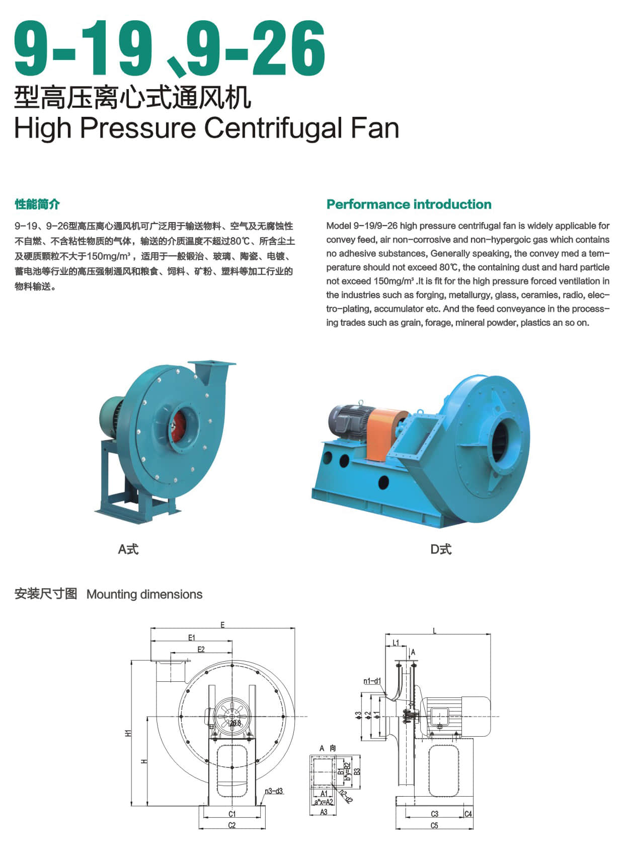 * Model 9-19/9-26 high pressure centrifugal fan Is widely applicable for convey feed, air non-corrosive and non-hypergoic gas which contains no adhesive substances, Generally speaking,the convey med a temperature should not exceed 800C,the containing dust and hard pa由cle not exceed 150mg/m³, It is fit for the high pressure forced ventilation In the industries such as forging, metallurgy, glass, ceramies, radio, electro-plating,accumulator etc. And the feed conveyance in the processing trades such as grain, forage, mineral powder, plastics an so on.
