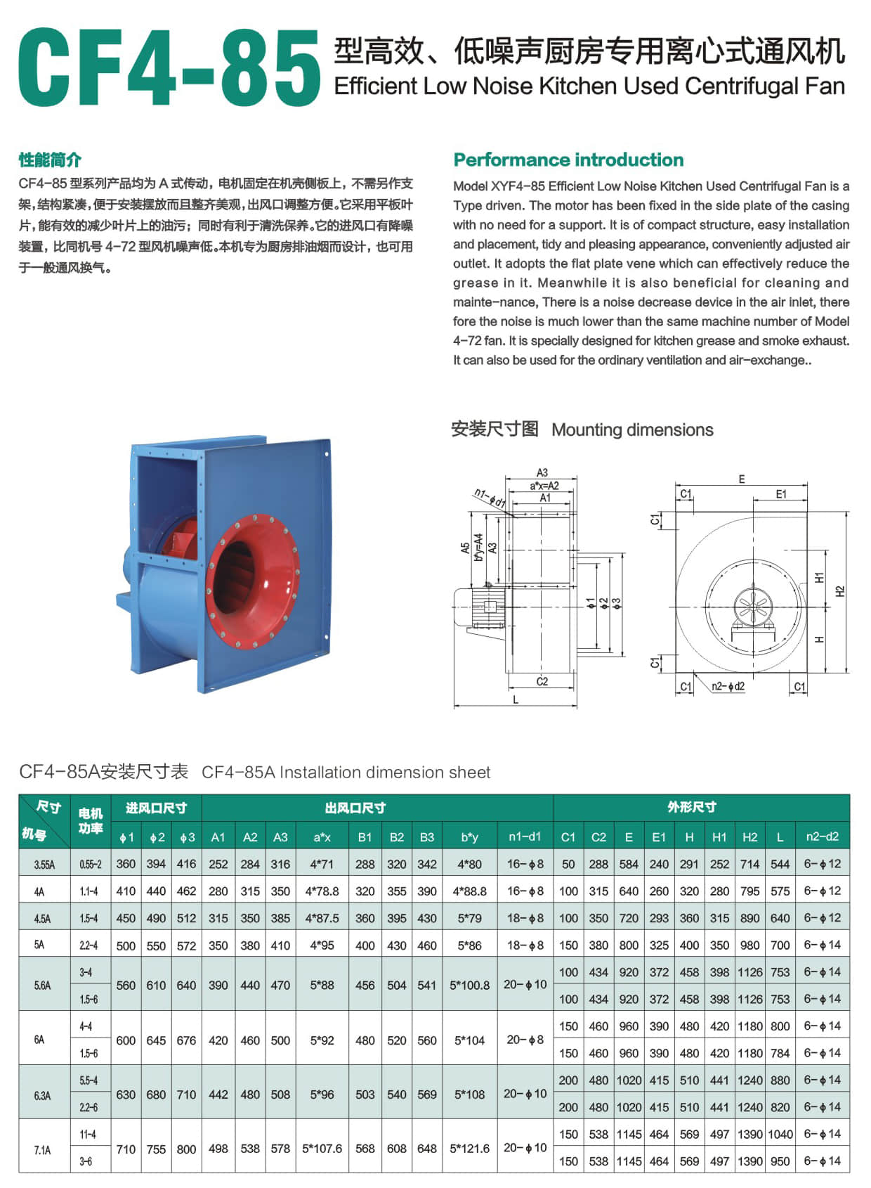 * Model XYF4-85 Efficient Low Noise Kitchen Used Centrifugal Fan is a Type driven. The motor has been fixed in the side plate of the casing with no need for a support. It is of compact structure, easy installation and placement, tidy and pleasing appearance, conveniently adjusted air outlet. It adopts the flat plate vene which can effectively reduce the grease In It. Meanwhile it is also beneficial for cleaning and mainte-nance, There is a noise decrease device In the air inlet, there fore the noise Is much lower than the same machine number of Model 4-72 fan. It is specially designed for kitchen grease and smoke exhaust. It can also be used for the ordinary ventilation and air-exchange.