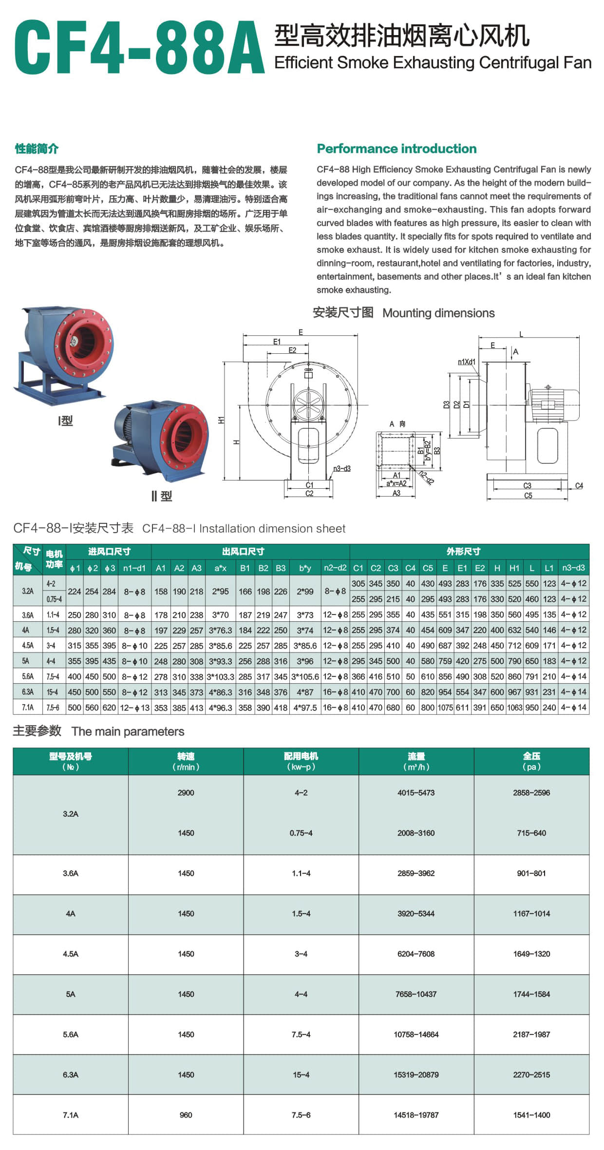 * CF4-88 High Efficiency Smoke Exhausting Centrifugal Fan Is newly developed model of our company. As the height of the modem buildings increasing, the traditional fans cannot meet the requirements of air-exchanging and smoke一exhausting. This fan adopts forward curved blades with features as high pressure, its easier to clean with less blades quantity. It specially爪s for spots required to ventilate and smoke exhaust. It Is widely used for kitchen smoke exhausting for dinning-room, restaurant,hotel and ventilating for factories, Industry,entertainment, basements and other places.lt' s an ideal fan kitchen smoke exhausting.