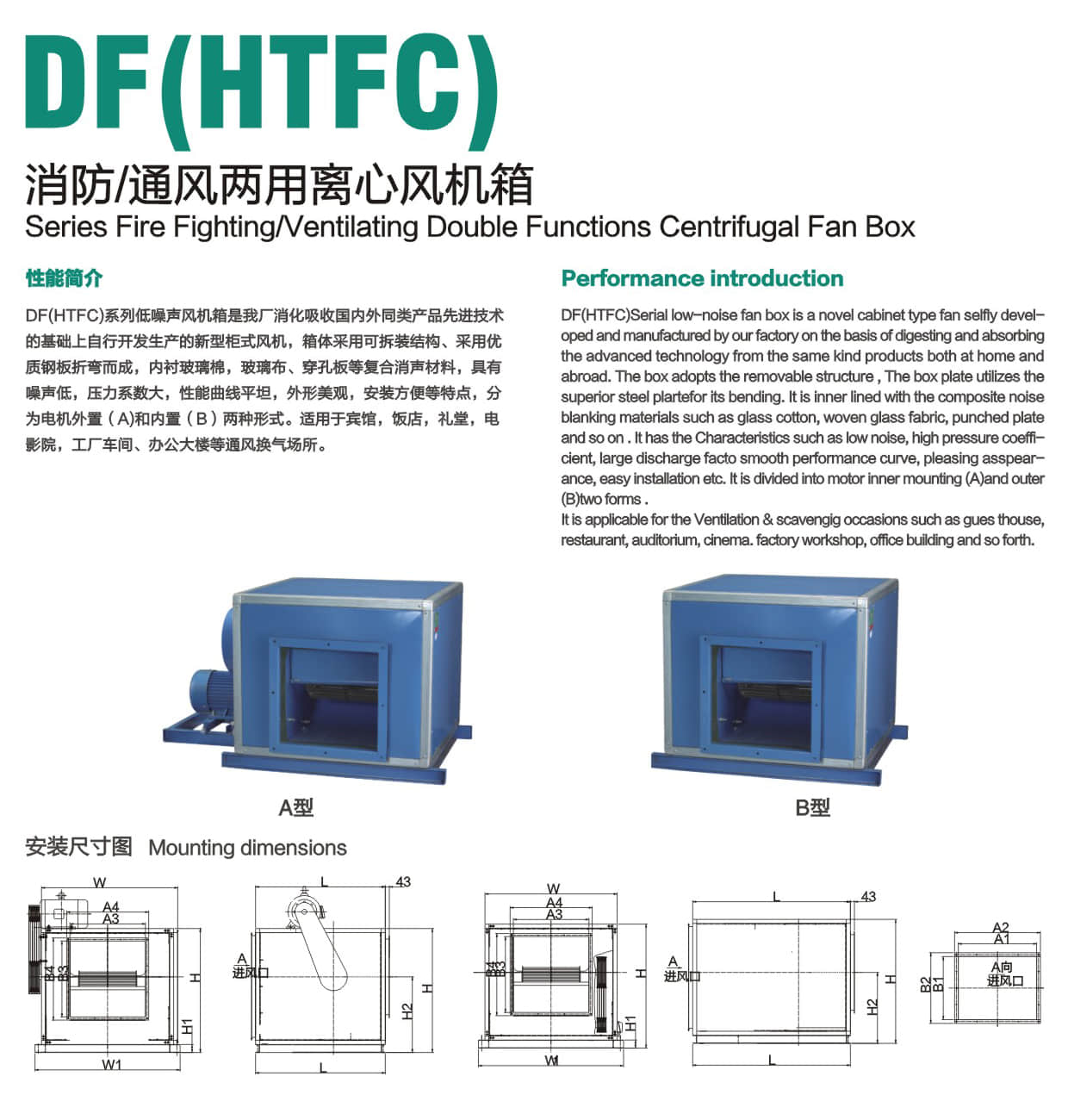 * DF (HTFC) Serial low-noise fan box is a novel cabinet type fan seifly devel-oped and manufactured by our factory on the basis of digesting and absorbing the advanced technology from the same kind products both at home and abroad. The box adopts the removable structure,The box plate utilizes the superior steel plartefor its bending. It is inner lined with the composite noise blanking materials such as glass cotton, woven glass fabric, punched plate and soon.It has the Characteristics such as low noise, h匆h pressure coeffldent, large discharge facto smooth performance curve, pleasing asspear6-anoe, easy installation etc. It is divided into motor inner mounting (hand outer (B)two forms.