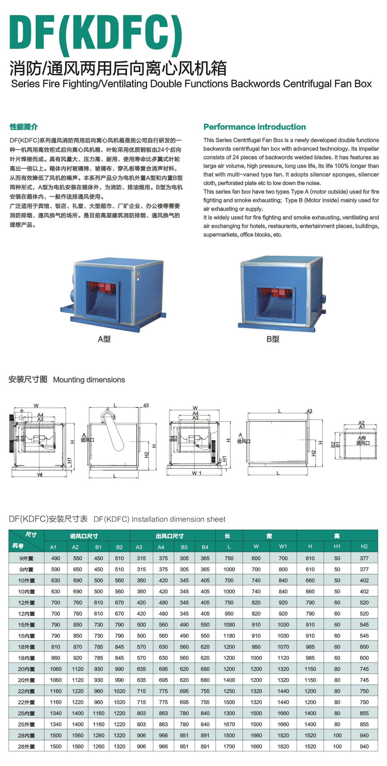 * This series fan box have two types Type A (motor outs(de) used for fire fighting and smoke exhausting; Type B (Motor inside) mainly used for air exhausting or supply·
