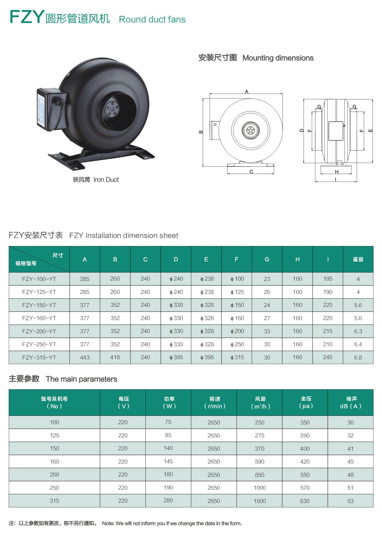 * FZY series circular duct fans into operation in two single-phase and three-phase asynchronous induction capacitor run.Widely used in hotels, senior clubs, supermarkets, restaurants, apartments, individual rooms, storage rooms, bathrooms and other long-distance transport and noise have local requirements.