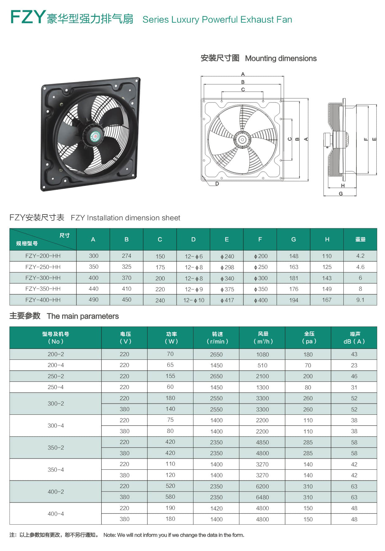 * FZY series axial fan into operation two single-phase and three-phase asynchronous induction capacitor run.Widely used in the ground need air volume control devices, large-scale electronic equipment, medical equipment. Computers,。币ce supplies automation, welding and other industries ventilation, can be used for building ventilation plant, ventilation, purification.