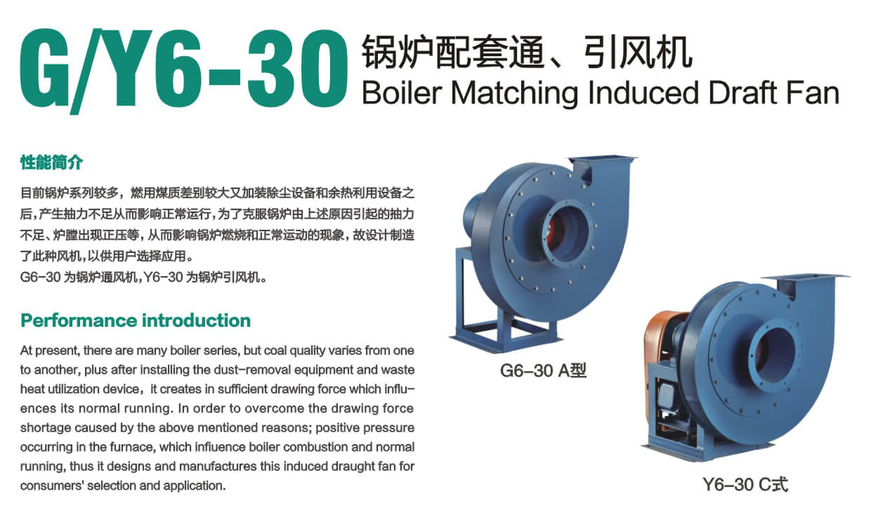 * At present, there are many boiler series, but coal quality varies from one to another, plus after installing the dust-removal equipment and waste heat utilization device,it creates in sufficient drawing force which influences its normal running.In order to overcome the drawing force shortage caused by the above mentioned reasons; positive pressure occurring In the furnace, which influence boiler combustion and normal running, thus it designs and manufactures this induced draught fan for consumers' selection and application.
