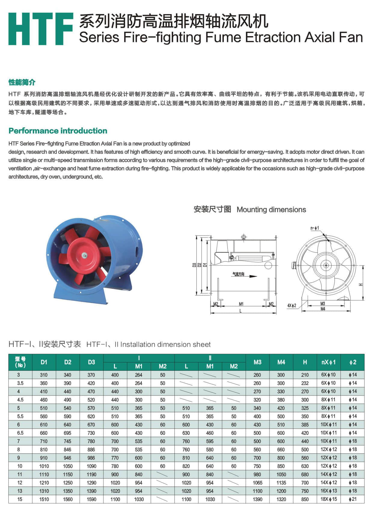 * HTF Series Fire-fighting Fume Etraction Axial Fan is a new product by optimized design, research and development it has features of h勺h efficiency and smooth curve. It Is beneficial for emergy-saving. it adopts motor direct driven. It can utilize single or mutti-speed transmission forms according to various requirements of the high-grade civil-purpose architectures in order to futfili the goal of ventilation, air-exchange and heat fume extraction during fire-fighting. This product is widely applicable for the occasions such as high-grade civil-purpose architectures, dry oven, underground, etc.