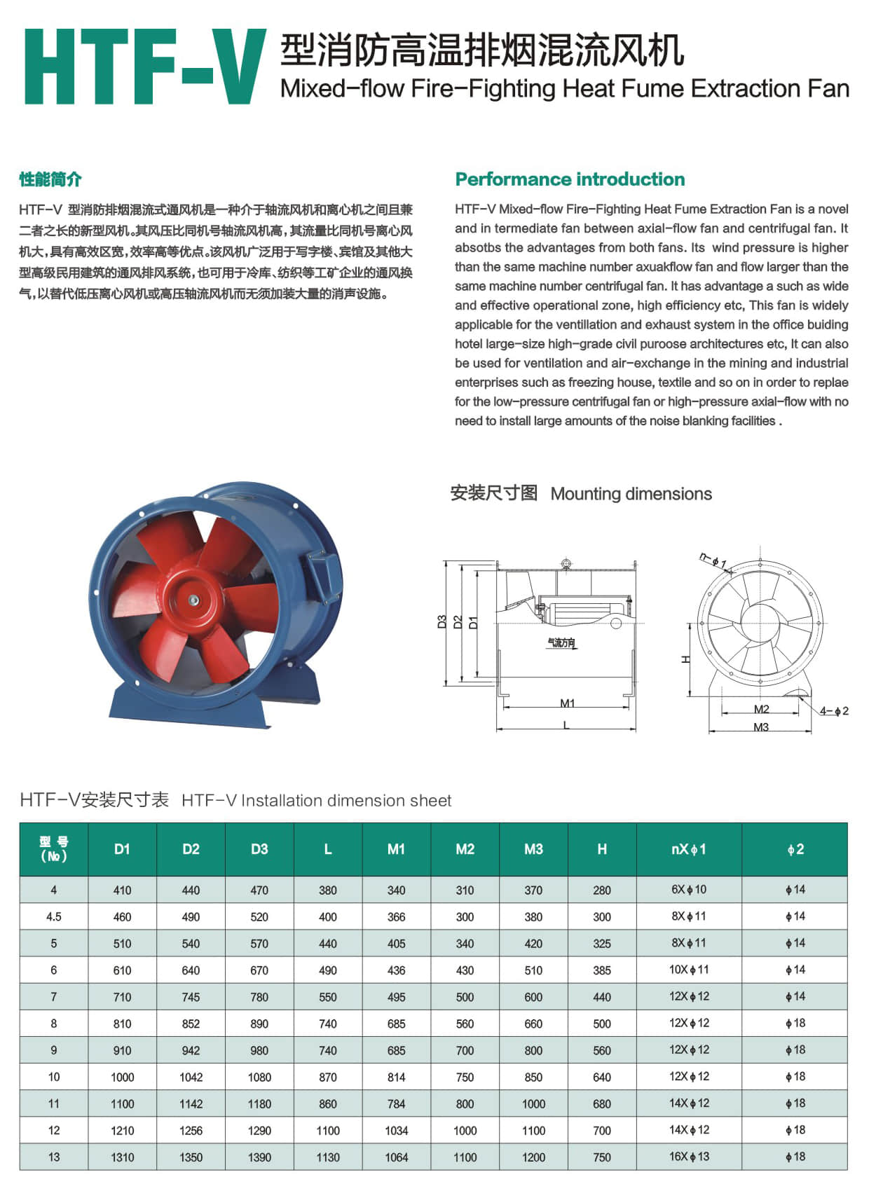 * HTF-V Mixed-flow Fire-Fighting Heat Fume Extraction Fan is a novel and in termediate fan between axial-flow fan and centrifugal fan.It absoths the advantages from both fans.Its wind pressure is higher than the same machine number axuakflow fan and flow larger than the same machine number centrifugal fan.It has advantage a such as wide and effective operational zone, high efficiency etc, This fan is widely applicable for the ventillation and exhaust system in the office buiding hotel large-size high-rade civil puroose architectures etc, It can also be used for ventilation and air-exchange In the mining and Industrial enterprises such as freezing house, textile and so on in order to replae for the low-pressure centrifugal fan or high-pressure axial-flow with no need to install large amounts of the noise blanking facilities.