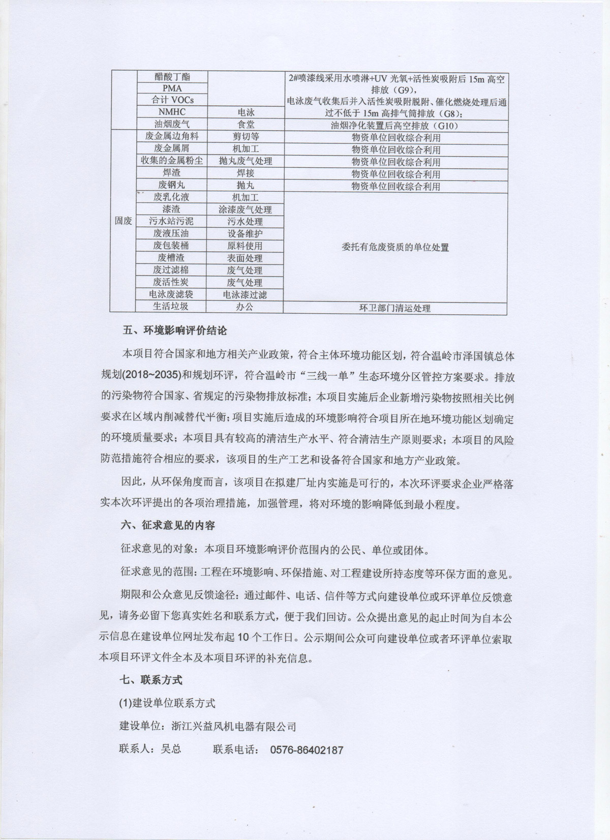 Zhejiang Xingyi Ventilator Electrical Appliance Co., Ltd. Annual Production of 310000 Fans and 70000 Motors Technical Renovation Project Environmental Impact Assessment Second Announcement