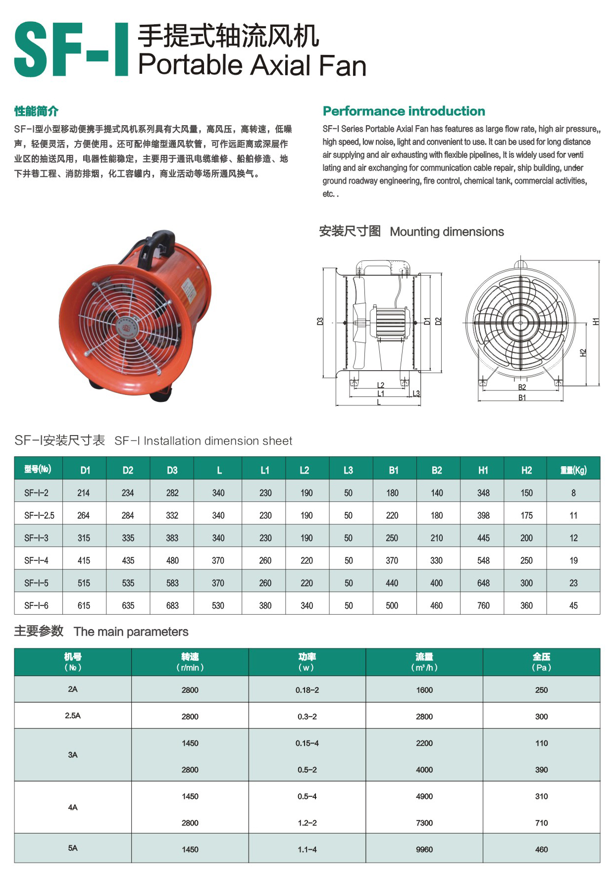 * SF-I Series Portable Axial Fan has features as large flow rate, high air pressure,, high speed, low noise, light and convenient to use. It can be used for long distance air supplying and air exhausting with flexible pipelines, It is wide份used for vent lating and air exchanging for communication cable repair, ship building, under ground roadway engineering, fire control,比emical tank, commercial activities, etc.