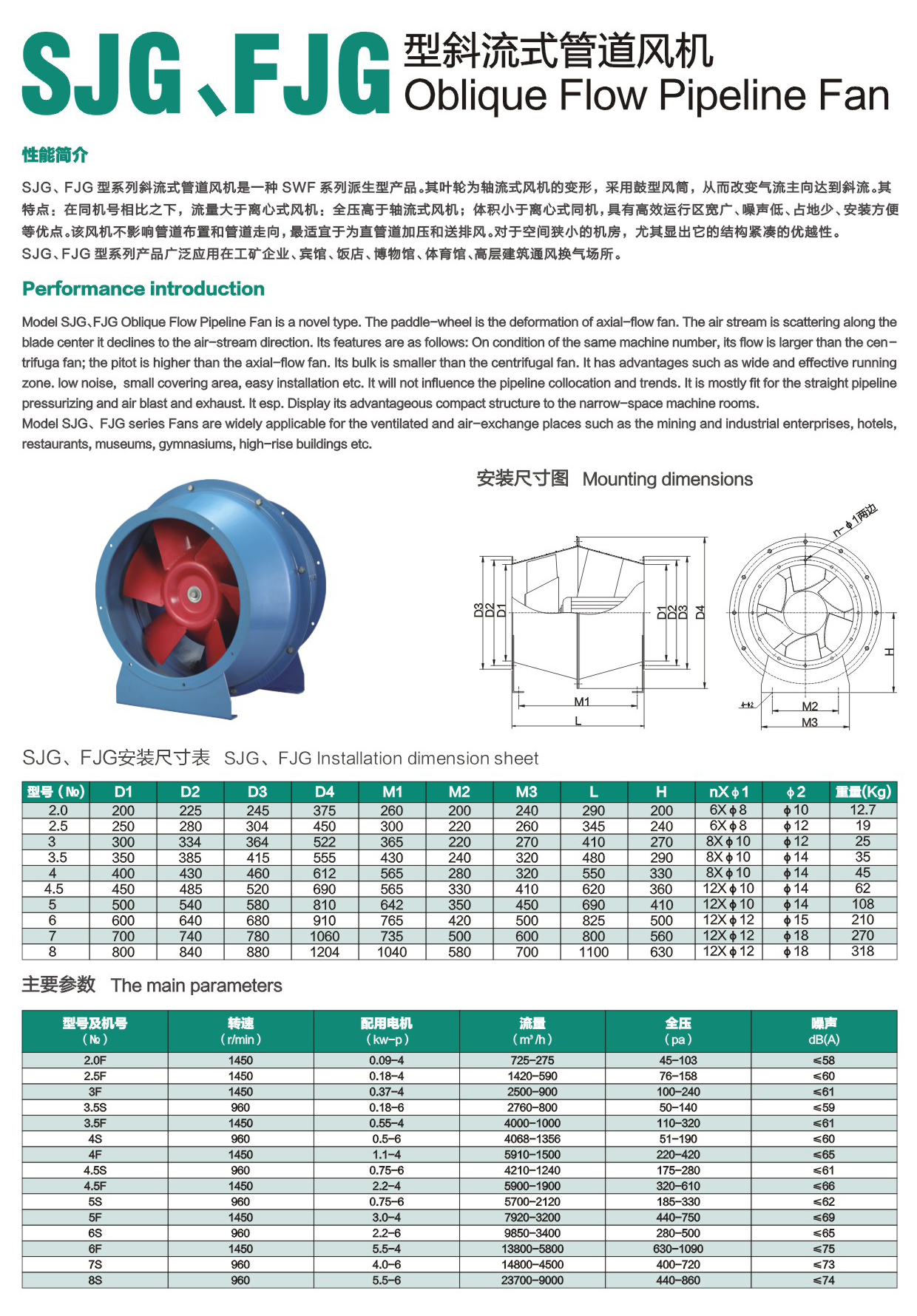 * Model SJG, FJG Oblique Flow Pipeline Fan is a novel type.The paddle-wheel Is the deformation of axial-flow fan. The air stream Is scattering along the blade center it declines to the air-stream direction. Its features are as follows: On condition of the same machine number, its flow Is larger than the con-trifuga fan; the pitot is higher than the axial-flow fan. Its bulk is smaller than the centrifugal fan. It has advantages such as wide and effective running zone. low noise, small covering area, easy Installation etc. It will not influence the pipeline collocation and trends. It Is mostly fit for the straight pipeline pressurizing and air blast and exhaust. It esp. Display its advantageous compact structure to the narrow-space machine rooms.