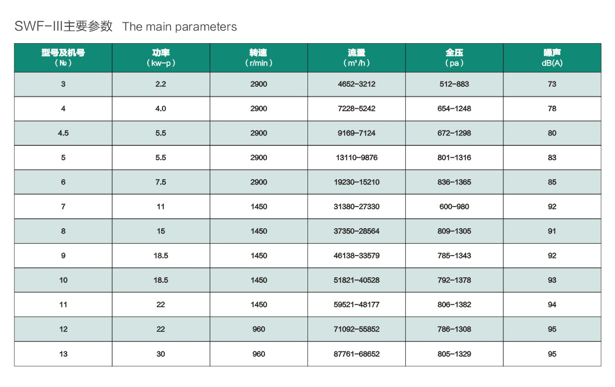 * SWF-Ⅰ. Ⅱ.Ⅲ Series Mixed-flow Fan is a new type of ventilator between Axial fan and Centrifugal Fan. Its air pressure is higher than that of the same numbers of axial fan, while its flow rates Is higher than that of the same numbers of centrifugal fan. It has features as wider efficiency areas, higher efficiency, etc. It Is widely used for hotels, office blocks, and high lass buildings, refrigeration storage, textle industry, and other industrial and mineral plants to take place of low pressure centrifugal fan or high pressure axial fan so as to save a lot of silencers.
