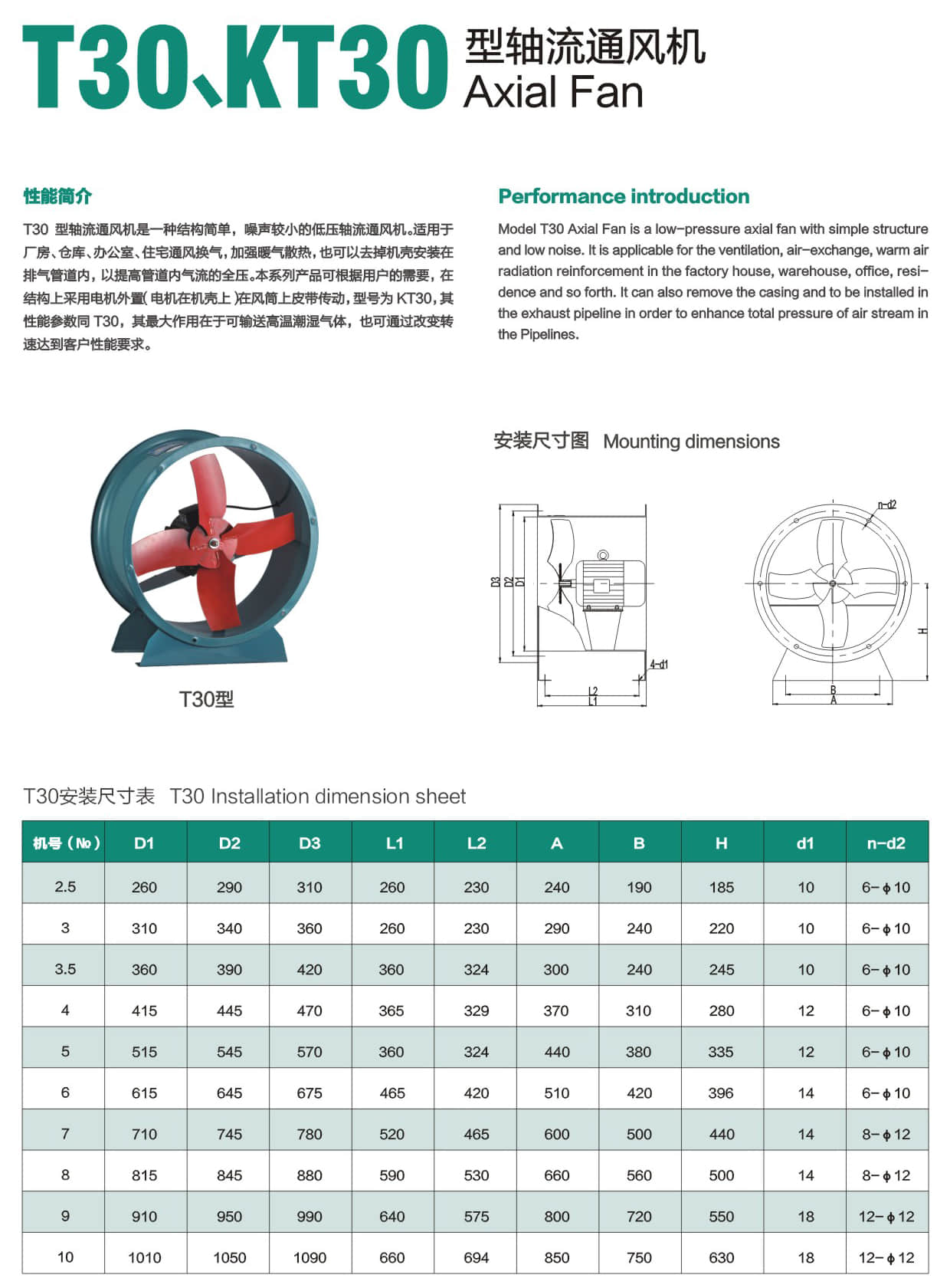 * Model T30 Axial Fan is a low-pressure axial fan with simple structure and low noise. It Is applicable for the ventilation, air-exchange, warm air radiation reinforcement in the factory house, warehouse, office, residence and so forth. It can also remove the casing and to be Installed In the exhaust pipeline in order to enhance total pressure of air stream in the Pipelines.