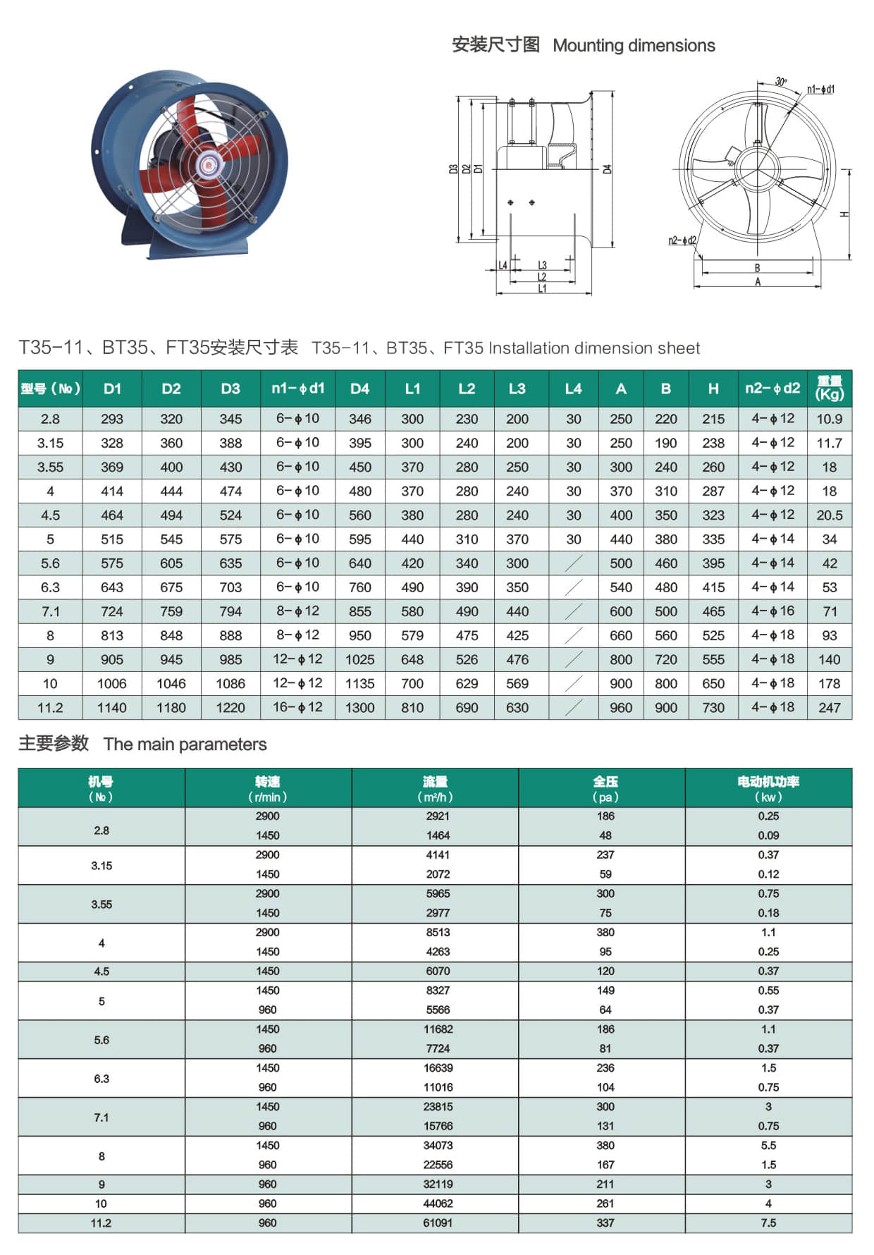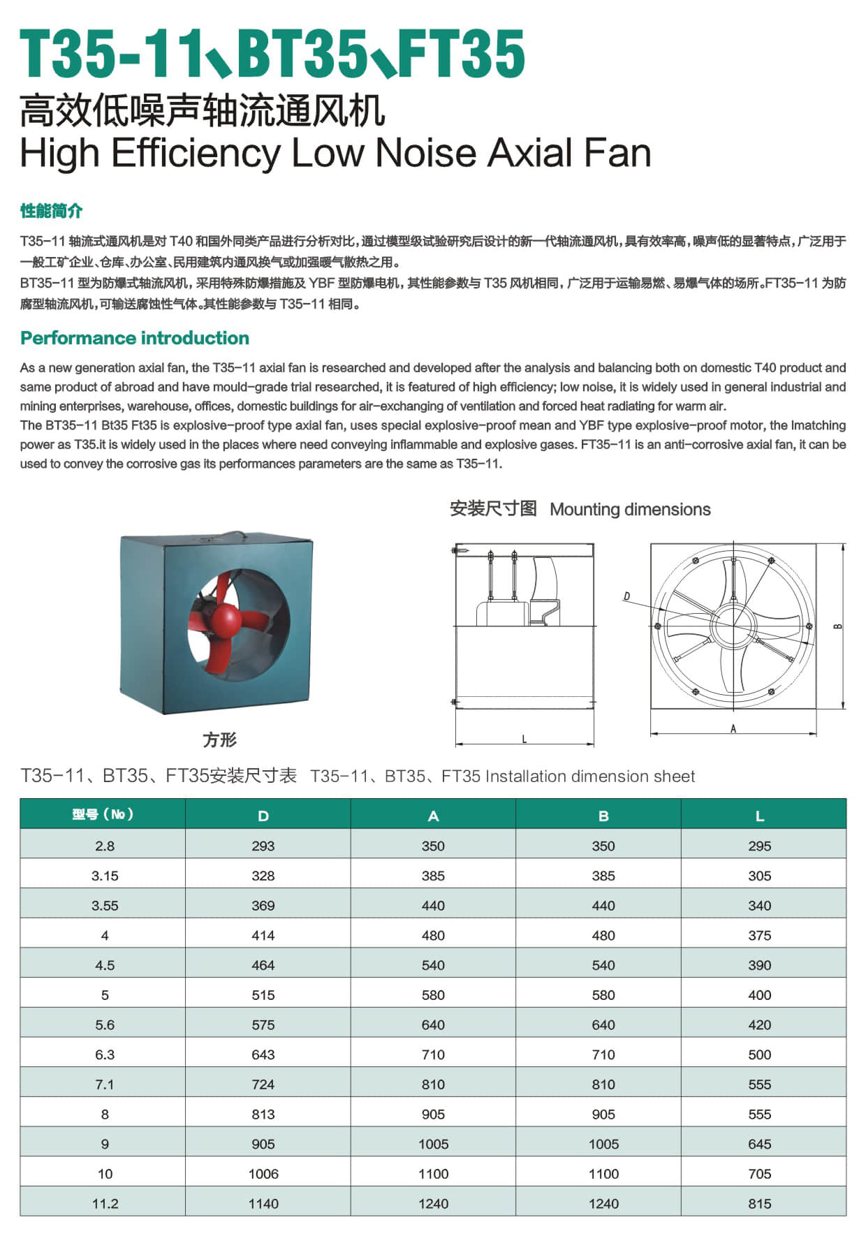 * As a new generation axial fan, the T35-11 axial fan is researched and developed after the ana叭is and balancing both on domestic T40 product and same product of abroad and have mould-grade trial researched, It Is featured of high efficiency; low noise, it Is wide扮used in general industrial and mining enterprises, warehouse, offices, domestic buildings for air-exchanging of ventilation and forced heat radiating for warm air.