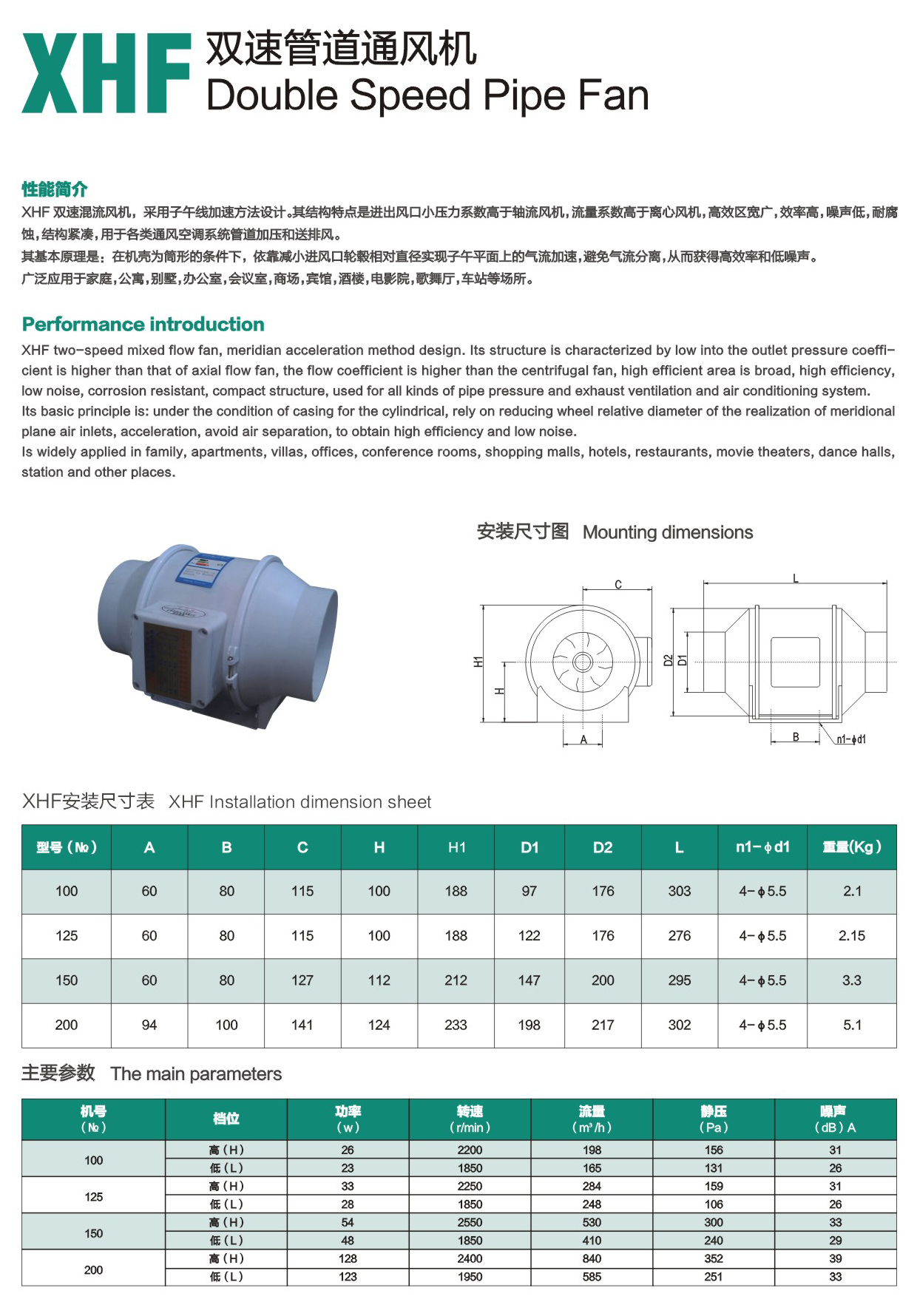 * XHF two-speed mixed flow fan, meridian acceleration method design. Its structure Is characterized by low into the outlet pressure coeffi-dent Is higher than that of axial flow fan, the flow coefficient Is higher than the centrifugal fan, high efficient area Is broad, high efficiency, low noise, corrosion resistant, compact structure, used for all kinds of pipe pressure and exhaust ventilation and air conditioning system.