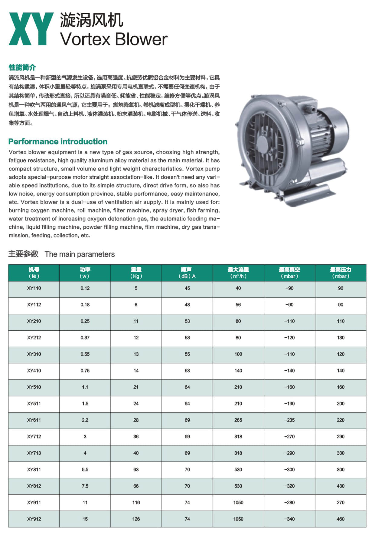 * Vortex blower equipment is a new type of gas source, choosing high strength, fatigue resistance, high quality aluminum alloy material as the main material. It has compact structure, small volume and light weight characteristics. Vortex pump adopts special-purpose motor straight association-like. It doesn't need any variable speed Institutions, due to its simple structure, direct drive form, so also has low noise, energy consumption province, stable performance, easy maintenance, etc. Vortex blower is a dual一use of ventilation air supply. It is mainly used for: burning oxygen machine, roll machine, filter machine, spray dryer, fish farming, water treatment of increasing oxygen detonation gas, the automatic feeding machine, liquid filling machine, powder filling machine, film machine, dry gas transmission, feeding, collection, etc.