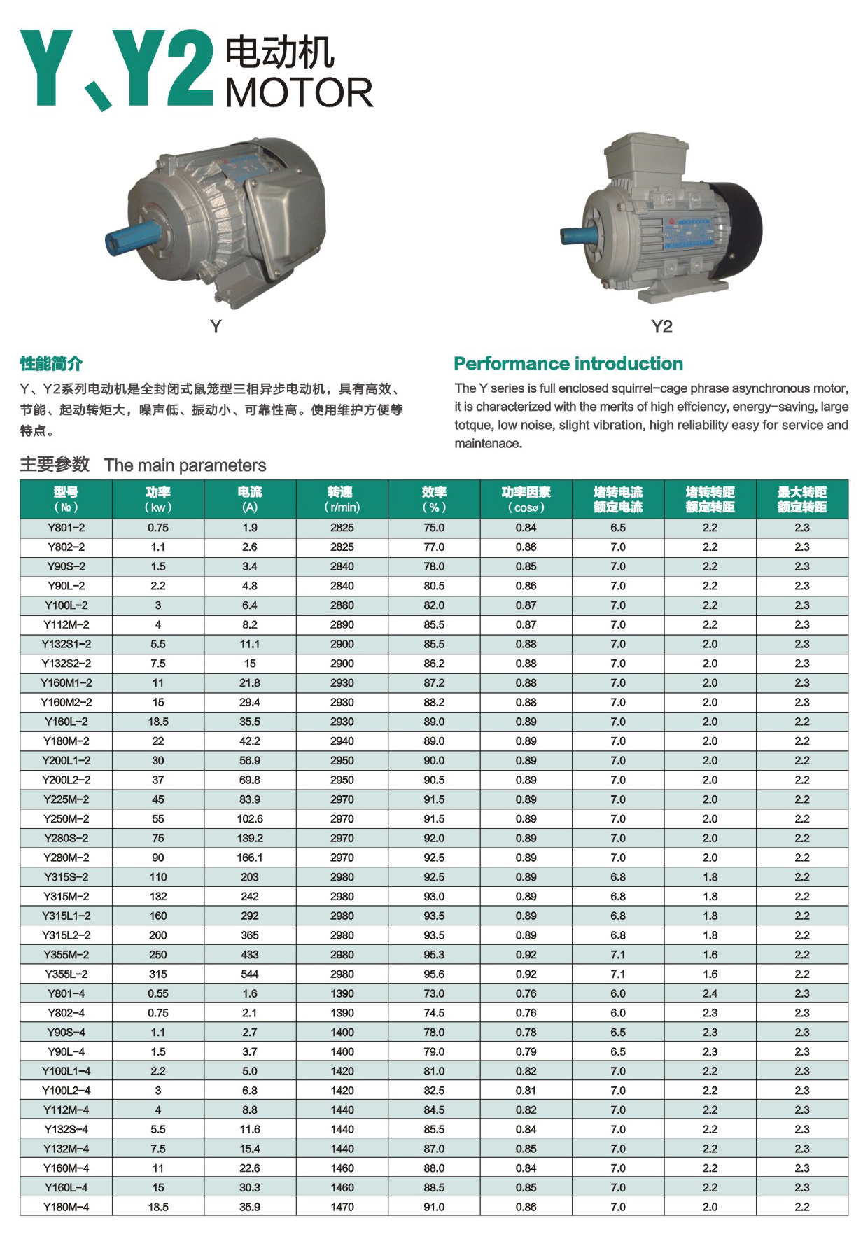 * The Y series is full enclosed squirrel-cage phrase asynchronous motor, it is characterized with the merits of h匆h effciency, energy-saving, large totque, low noise, slight vibration, high reliability easy for service and maintenace.