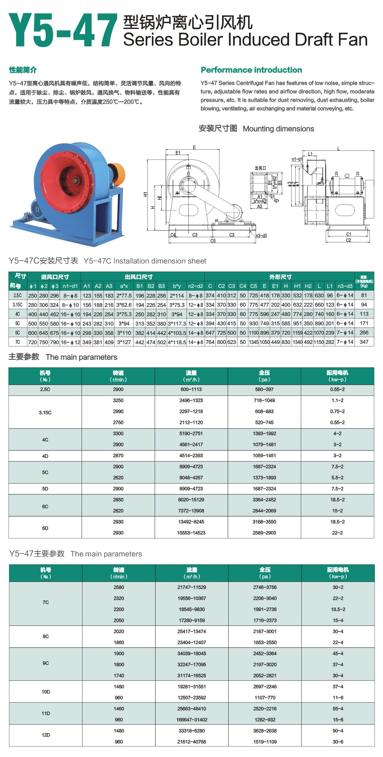 * Y5-47 Series Centrifugal Fan has features of low noise, simple structure, adjustable flow rates and airflow direction, high flow, moderate pressure, etc. It is suitable for dust removing,dust exhausting,boiler blowing, ventilating, air exchanging and material conveying, etc.