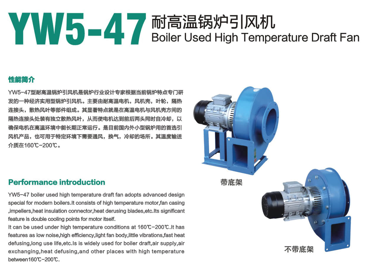 * YW5-47 boiler used high temperature draft fan adopts advanced design special for modem boilers.It consists of high temperature motor,fan casing ,impellers,heat insulation connector,heat derusing blades,etc.Its significant feature is double cooling points for motor itself.